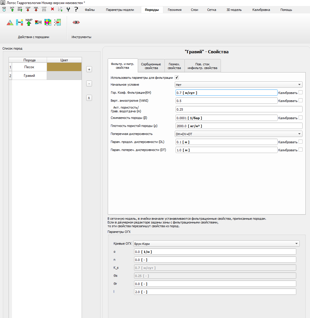При моделировании насыщенно-ненасыщенной фильтрации, а также при подготовке геологической модели для задания неоднородно распределенных в пространстве геофильтрационных свойств возникает потребность в задании различных типов пород. Вкладка «Породы» (Рис. 1.4.2.1) предоставляет пользователю инструменты, необходимые для задания пород и наполнения их свойствами.