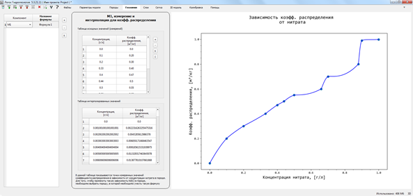 Во вкладке «Геохимия» (Рис. 1.4.3.1) производится задание зависимости коэффициента распределения Kd от концентрации нитрата, когда в модели происходит одновременное распространение нитратов и радионуклидов.