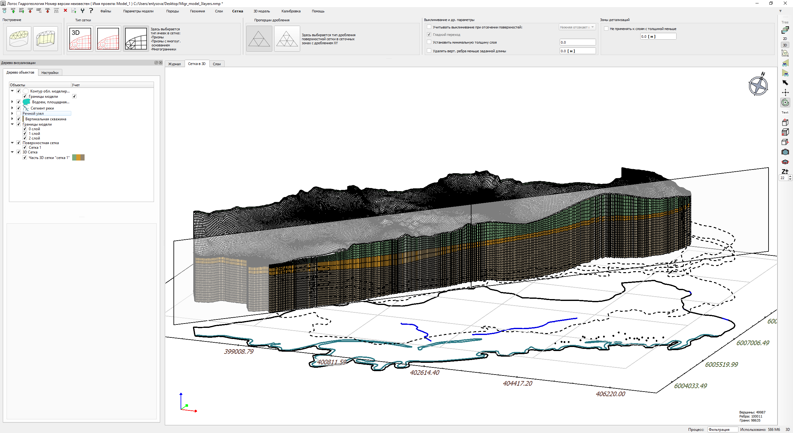 На (Рис. 1.1.1) представлен пример расчетной гидрогеологической модели, подготовленной в ЦП Логос Гидрогеология.