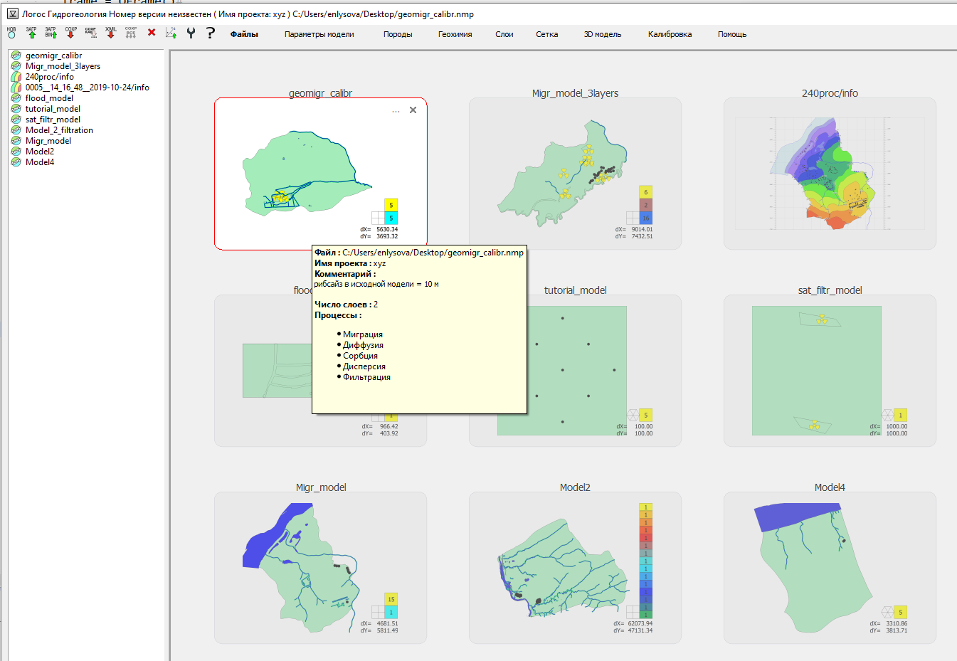 концептуальная модель: двоичный файл формата NMP, который содержит всю информацию о модели (гидрогеологические объекты, растры, параметры расчета и т.д.). Этот файл используются только препроцессором.