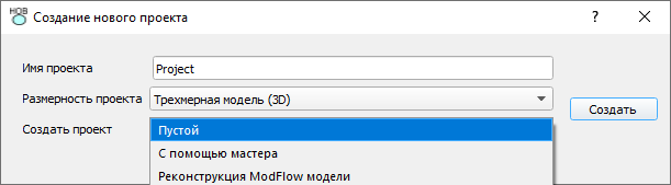 «Создать проект» – выбрать из списка способ создания проекта: «Пустой», «С помощью мастера», «Реконструкция Modflow модели».