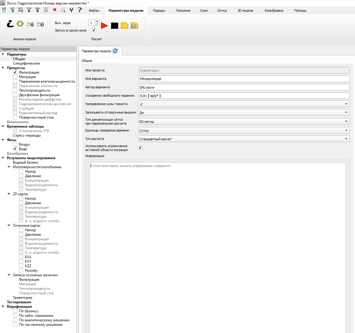Во вкладке «Параметры модели» (Рис. 1.4.1.1) содержатся различные категории параметров, необходимые для подготовки и расчета модели. Категории параметров представлены в виде дерева и расположены в левой части рабочего окна. В зависимости от выбора категории параметров справа от дерева отображается соответствующая форма для задания параметров.